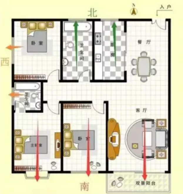 一般來講:朝南的房屋采光好,冬暖夏涼,也不會太潮濕,是最受歡迎的朝向;朝西的房屋有西曬,下午的采光不錯,但是夏天有西曬的困擾;朝東的房子早晨和上午采光好,光線相比朝西的房子要柔和;朝北的房子采光差,夏天比較涼快,但是冬天就比較陰冷。