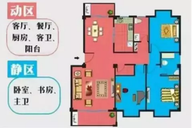所謂“動靜分離”,就是把動區(qū)(客廳、廚房、餐廳等)跟靜區(qū)(臥室、書房等)通過合理的空間布局給分離開來,在動區(qū)的活動保持的基礎下,又能讓靜區(qū)能夠保持一定的私密性,減少彼此之間的干擾。