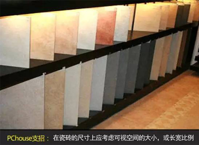 在瓷磚的尺寸上應(yīng)考慮可視空間的大小,如果客廳被家具遮擋的地方多,也就是地面使用時,人的實際可視的大小,如果可視面積小的話,也應(yīng)考慮用小一點(diǎn)規(guī)格的。又或者考慮客廳的長寬比例及大小,就效果而言,以瓷磚能全部整片鋪貼為好,就是指到邊盡量不裁磚或少裁磚,盡量的減少浪費(fèi),一般而言,瓷磚規(guī)格越大,浪費(fèi)也越大。