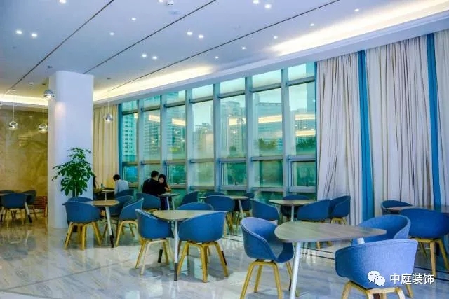 工作區(qū)與大廳的富麗堂皇迥然不同,藍色座椅十分清新!