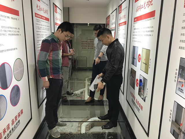 △【中航聯控股集團副總裁金洪路先生(右)向南寧慈銘代表團詳細介紹衛(wèi)生間施工工藝解剖】