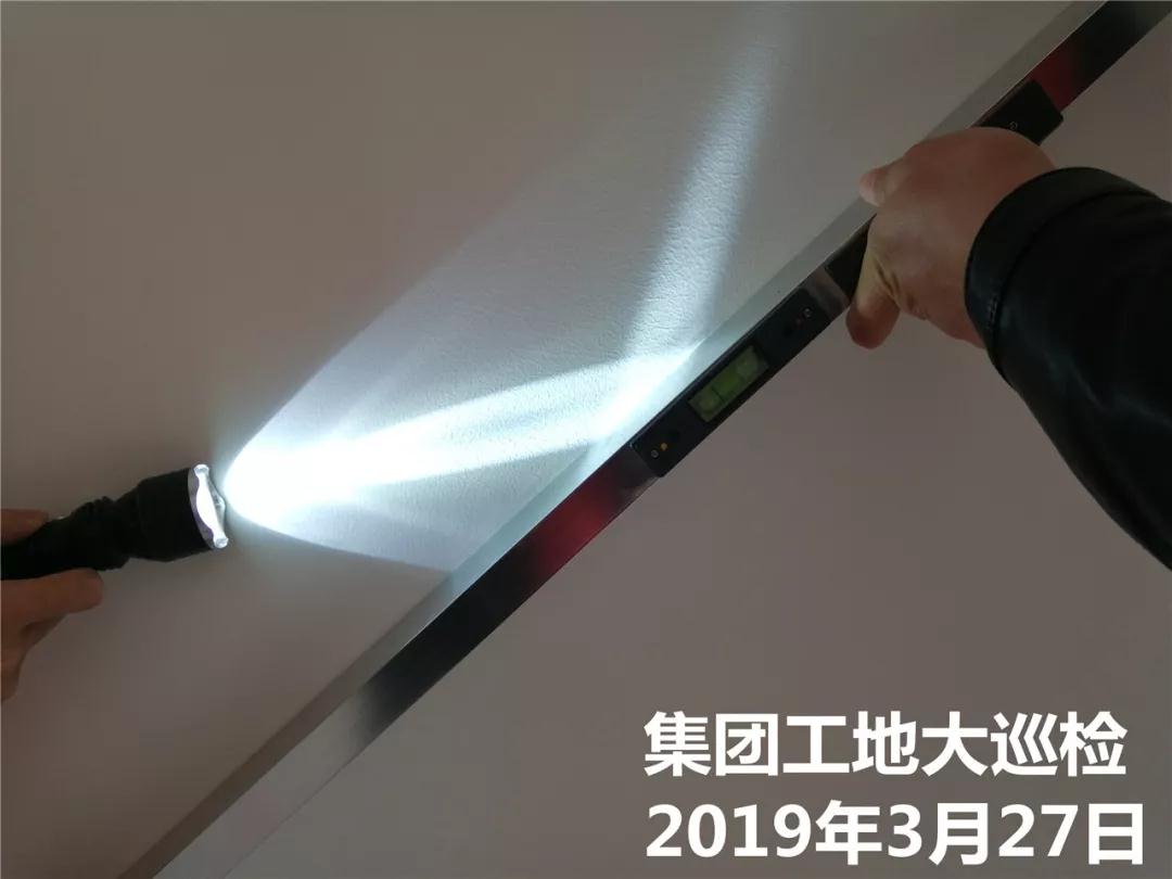 用靠尺和強光手電筒檢查墻面施工平整度,手電筒強光未能穿透墻面與靠尺間的縫隙,達到集團要求施工標準。