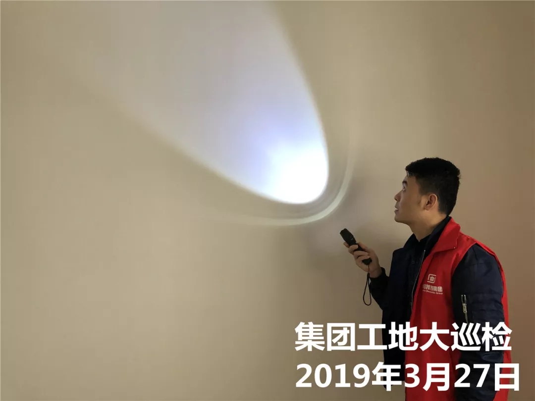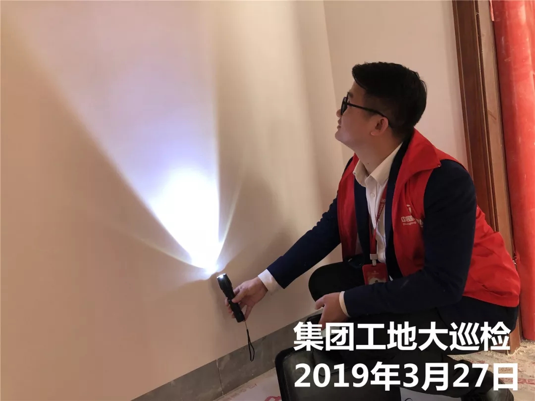 運營部成云總經(jīng)理與張立安總經(jīng)理用強光手電筒檢查墻面膩子施工