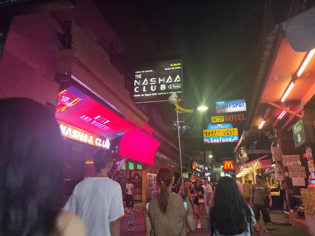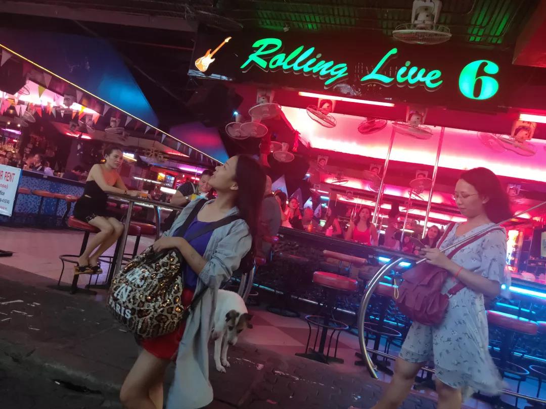 芭提雅泰俄風(fēng)情步行街兩旁有各式小吃、酒吧,街上熙熙攘攘,是游客必經(jīng)之地。酒吧中經(jīng)常有音樂(lè)表演、泰拳表演。行走的、兩旁酒肆咖啡屋閑坐的,十之七八是西方白種人。白天相對(duì)冷清,一到晚上燈火通明,夜夜笙歌,燈紅酒綠,這里是個(gè)一刻也不寧?kù)o的嘈雜世界,這是西方白人娛樂(lè)的天堂。