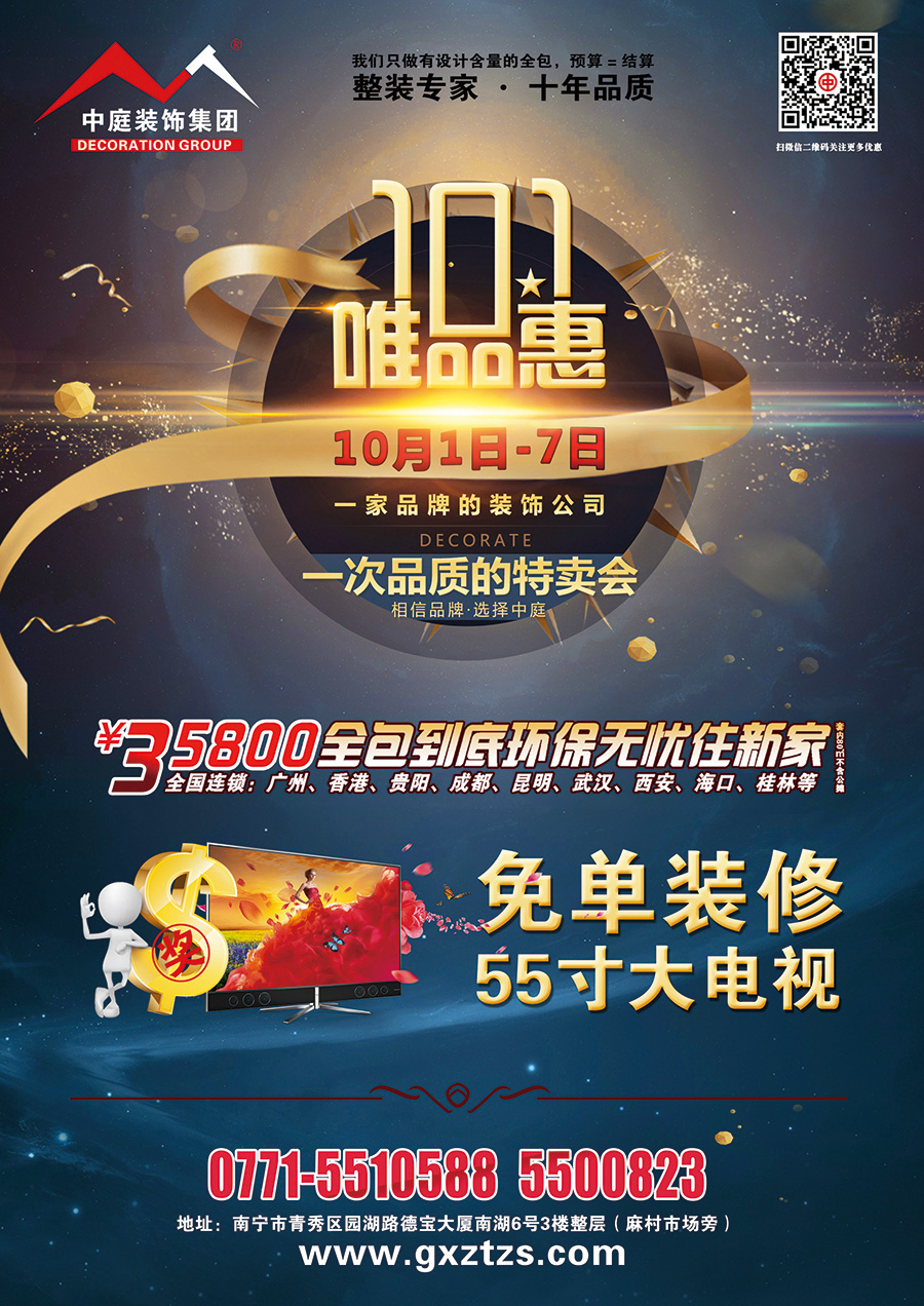 舉國同慶迎十一,中庭裝飾集團(tuán)推出大型家裝“唯品會”活動,一家品牌公司、一次品質(zhì)的特賣會,只為給您提供更舒心的家裝!