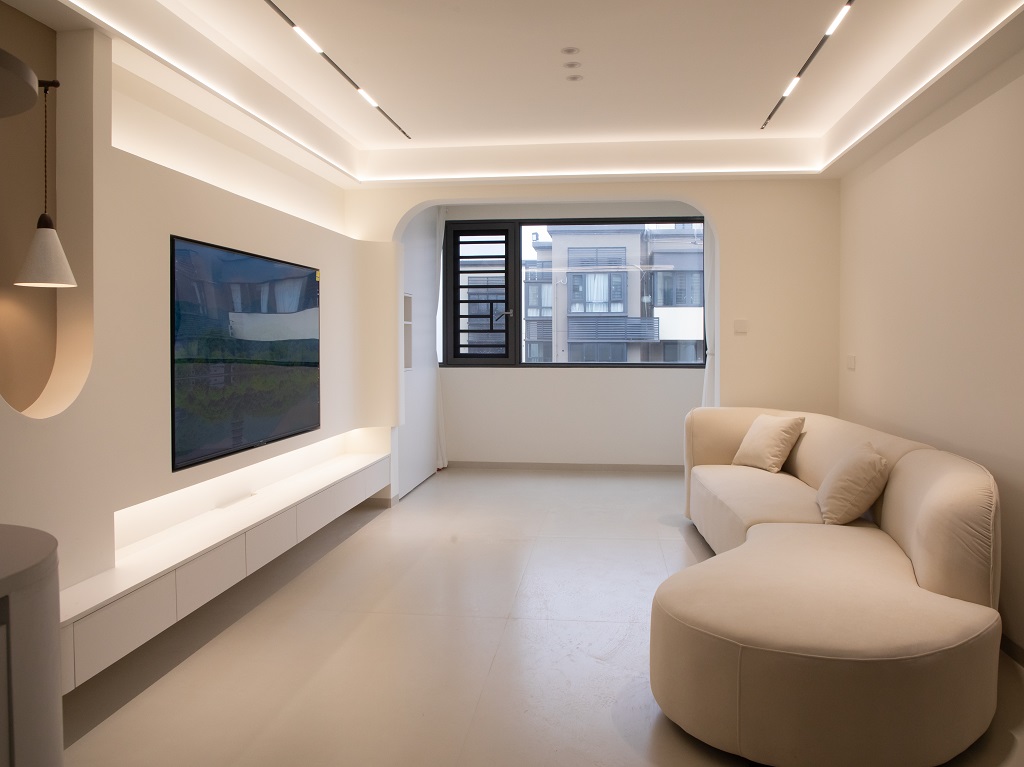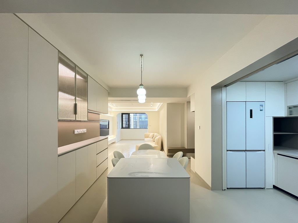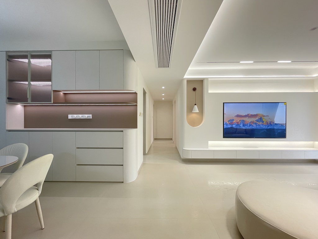 空間整體奶白色調(diào)裝飾,耶為空間帶來了充沛的光線,設計師整體結(jié)構上不設明顯的界定,在裝修次材料、色彩搭配上逐步描述空間的構成關系。