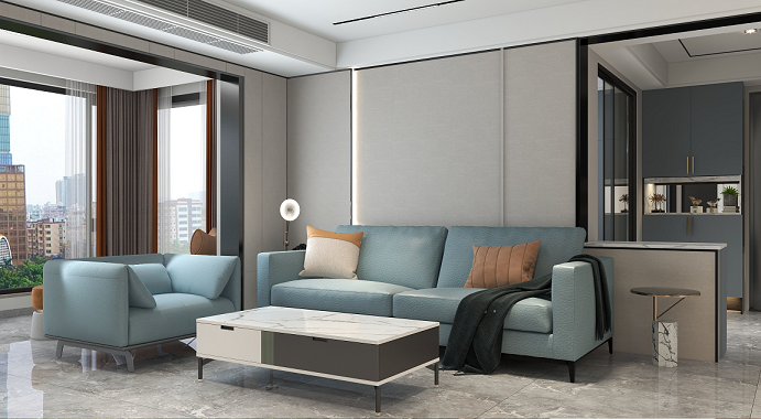 整個空間變得更加寬闊通透,視野也有一定的拓展,藍(lán)色系的空間在整個空間當(dāng)中變得更加大氣,再加上灰綠色的布藝沙發(fā),灰色的茶幾在色調(diào)上有的用的沖擊性豐富了整個空間當(dāng)中的層次。