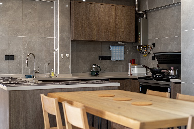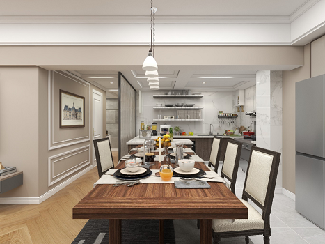 開放式廚房和餐廳可以共享操作,互不干擾,又可以加強(qiáng)家人之間的互動性提高家庭的幸福感。