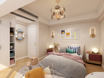 整個空間主要在軟裝搭配上做文章,運(yùn)用比較童趣的掛畫,掛件等裝飾,讓空間生動活潑起來。